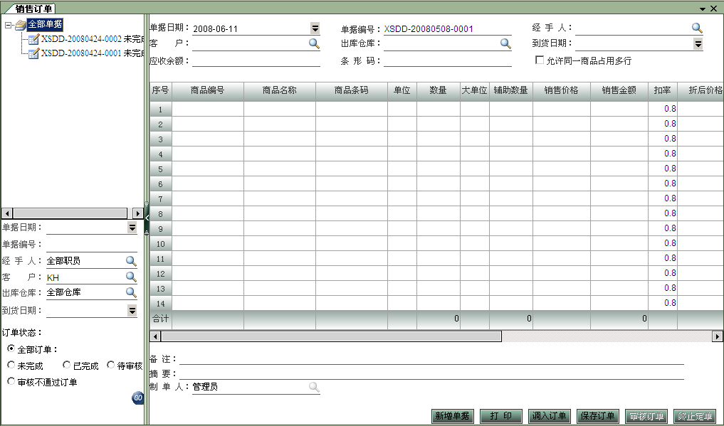 · 訂單中必須錄入的項目: 訂單必須錄入訂貨客戶、經(jīng)辦人、銷售訂貨商品名稱、數(shù)量、單價(金額)。其它項目的錄入有利于更方便、更的查詢與統(tǒng)計,但不是必須項。