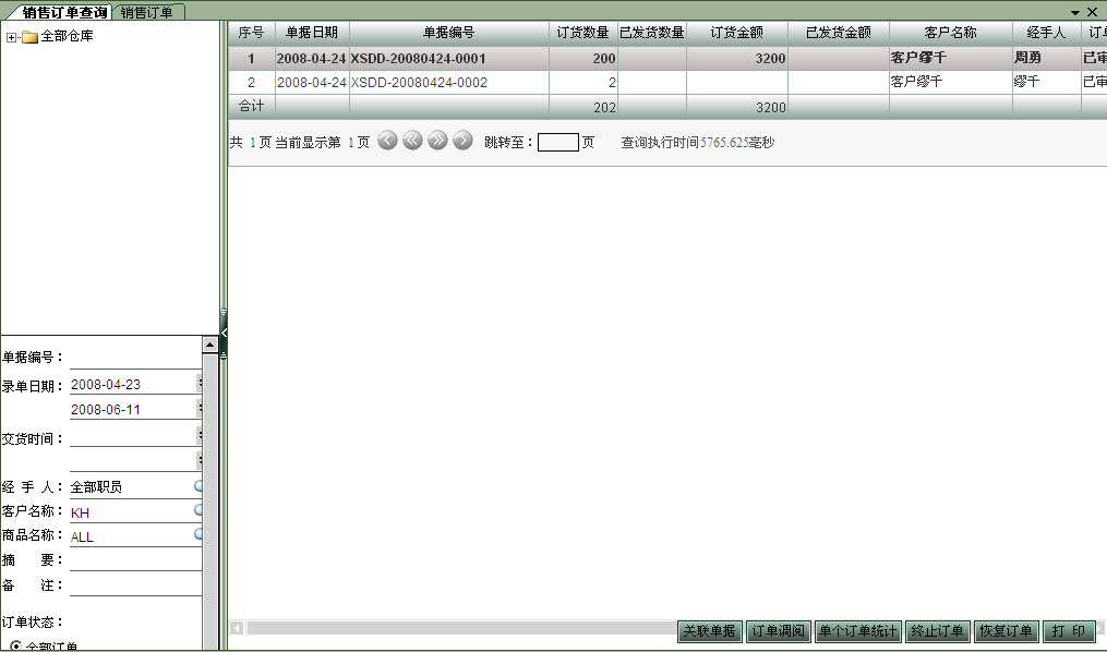 可以根據(jù)不同條件對銷售訂單查詢:錄單日期、交貨時間、單據(jù)編號、經(jīng)手人、供應商、入貨倉庫、摘要、說明、運單號、承運單位及電話、物件數(shù)量、包裝方式、備注。并且可以選擇未完成、已完成或全部訂單進行查詢。