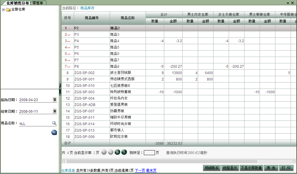 · 線性列表:對統(tǒng)計的商品不分類別全部列出,并過濾掉銷售數(shù)量和金額均為零的商品。