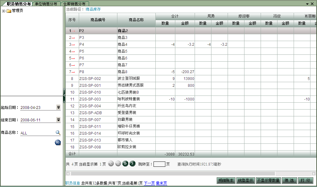 由用戶設置好查詢時間、商品名稱、職員名稱后,按確定,進入報表顯示界面。 界面如下圖: