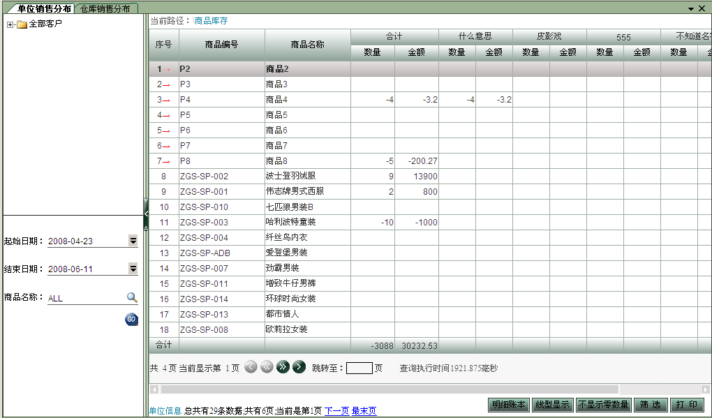 統(tǒng)計某商品的某一時間段內(nèi)對不同客戶的銷售情況。包括銷售數(shù)量、金額及其占該商品銷售總量的比例包括倉庫銷售分布、單位銷售分布和職員銷售分布。